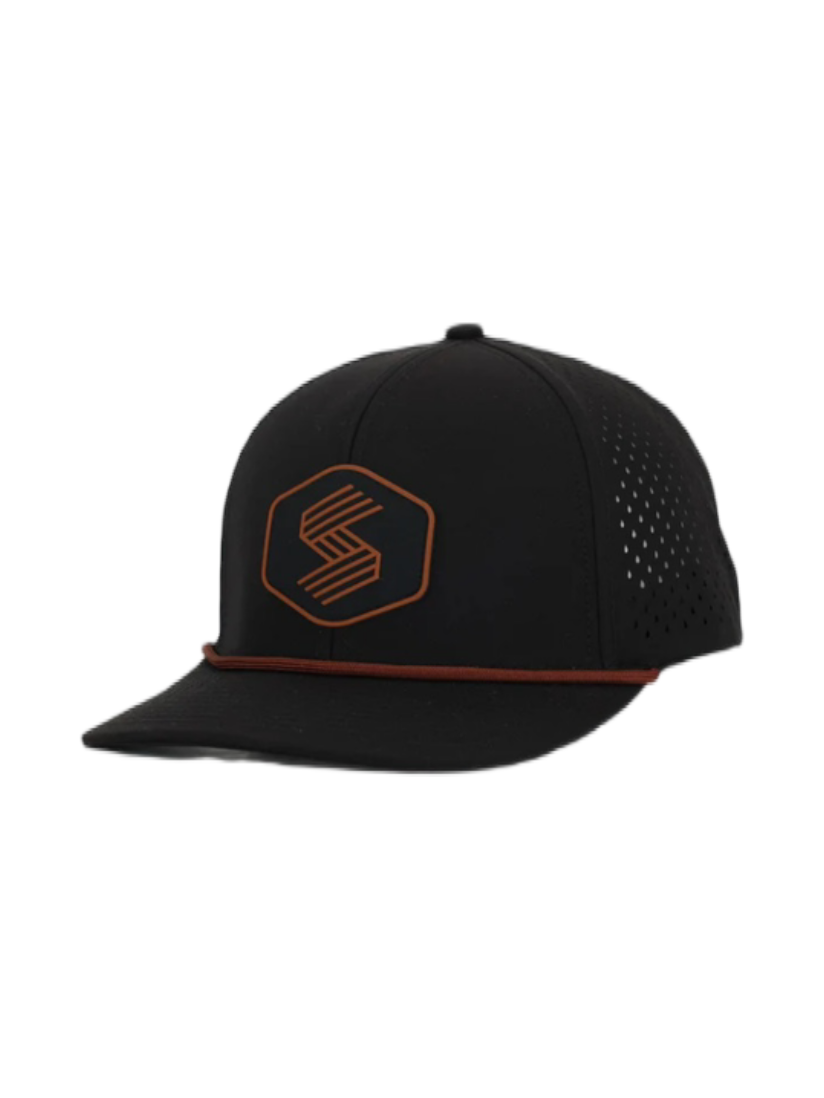 Clean black hat with orange rubber Status 'S' patch and modern rope style details.
